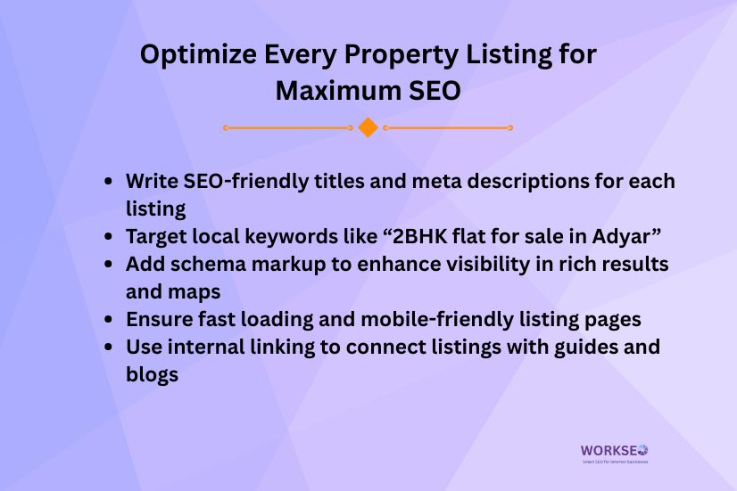 Every property listing is a powerful way to attract search traffic—if it’s optimized correctly. At WorkSEO, we view each listing as a valuable SEO opportunity. As a leading real estate SEO company, we ensure your apartments, villas, and plots are discoverable by the right buyers at the right time.